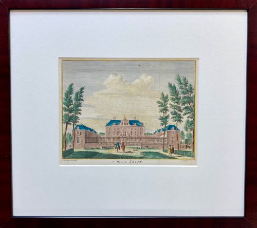 NZe01 Zeist, Slot Zeist, 't Huis te Zeist, handgekleurde kopergravure van Hendrik Spilman, uitgegeven door Isaak Tirion in 1750 te Amsterdam. Met vouw en marges zoals uitgegeven. Ingelijst met museumglas en passepartout.