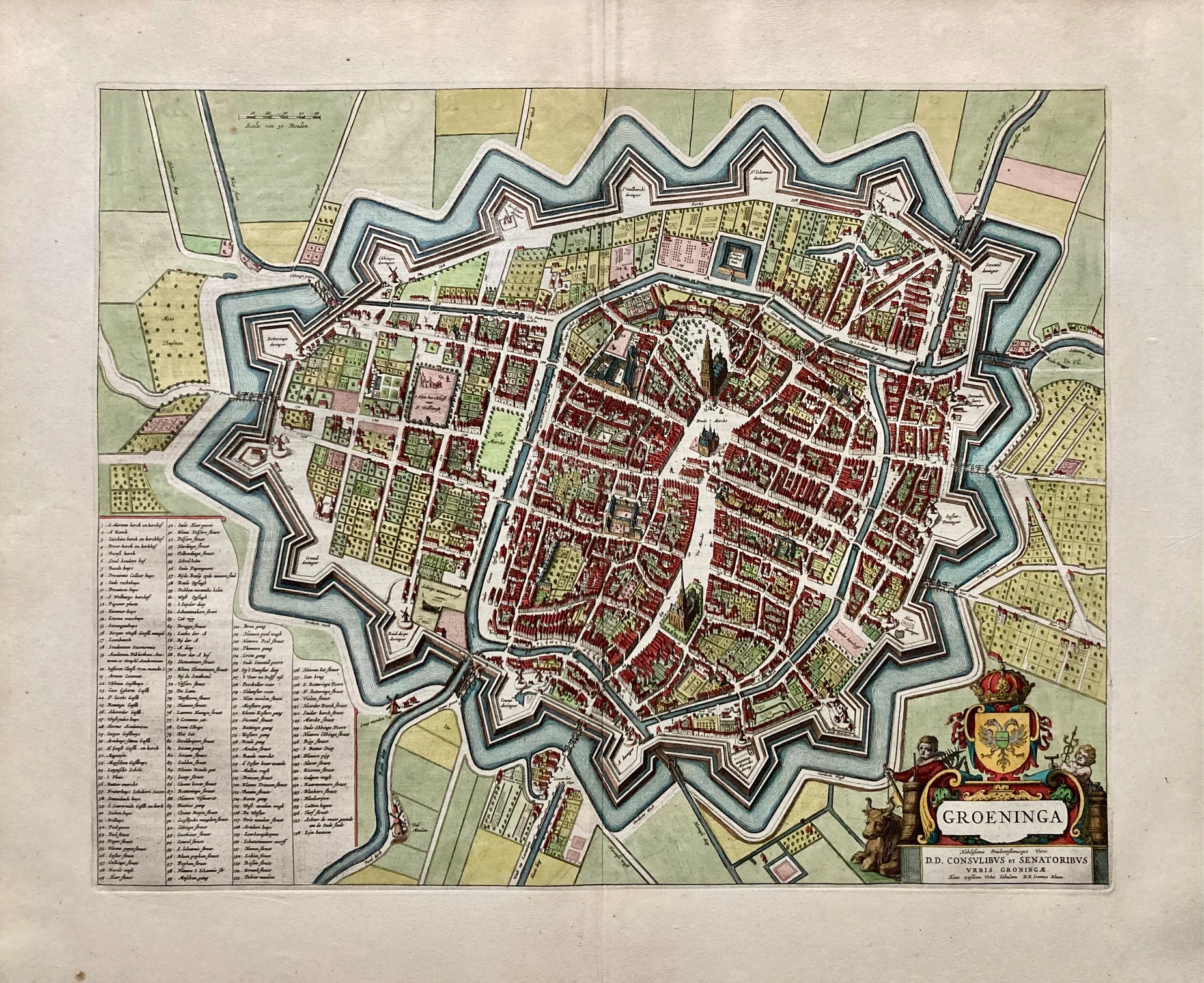 Verso: Groninga, stadsbeschrijving in het Latijn. Groot folioformaat, kaartbeeld: 41,5x52cm.