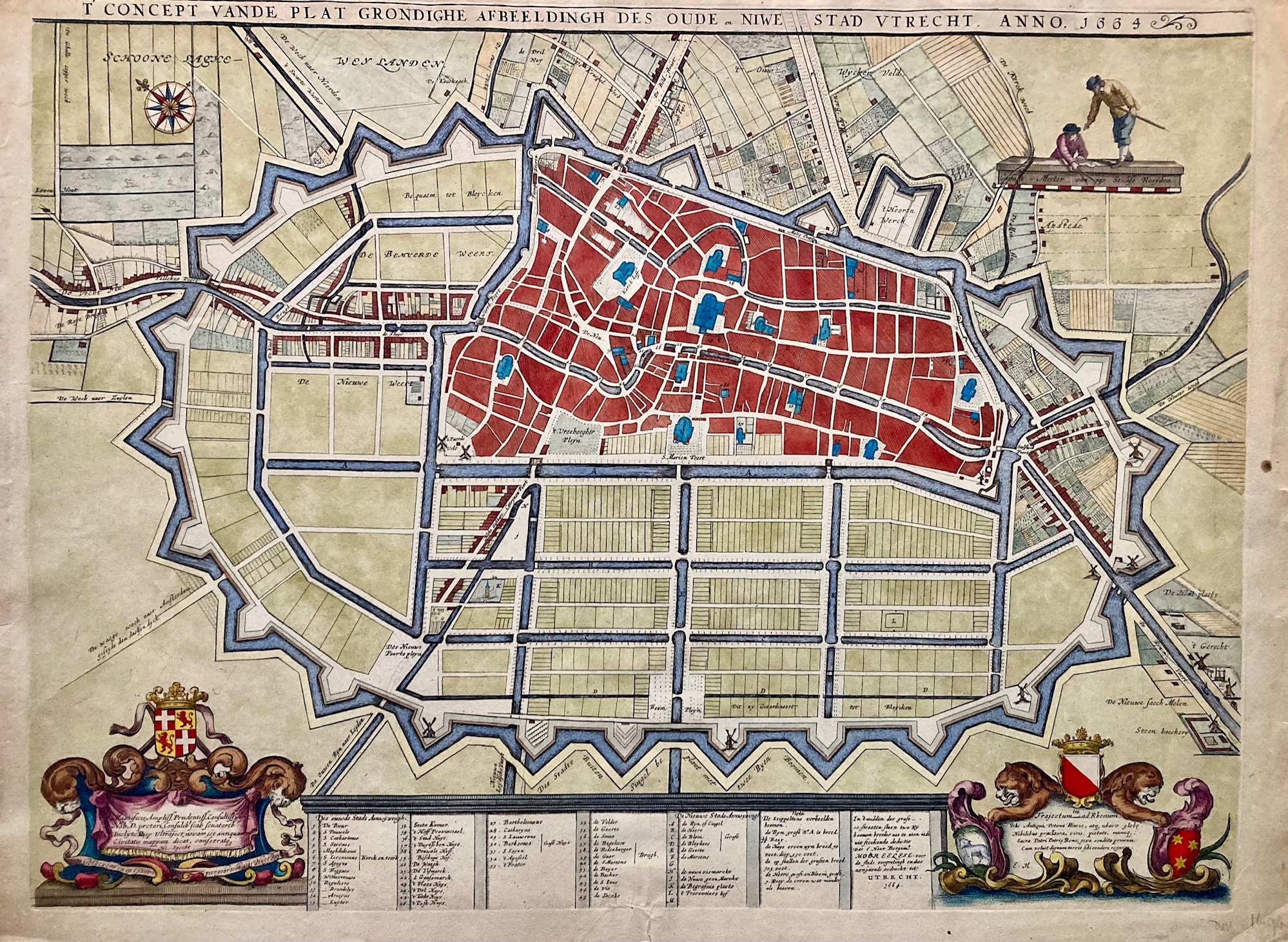 Handgekleurd, met cartouches, uitgebreide legenda en afbeelding landmeters.