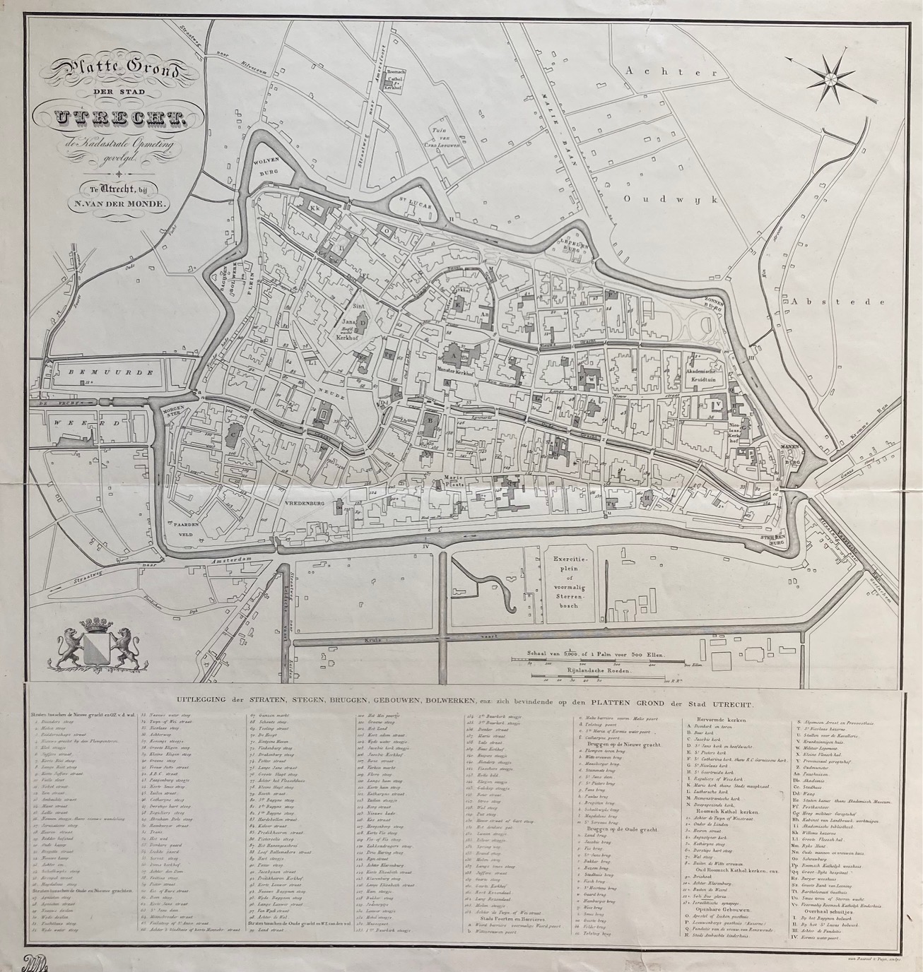 Groot formaat plattegrond van de Domstad, vervaardigd onder toezicht van G.F. Baron von Derfelden van Hinderstein en uitgegeven door Nicolaas van der Monde in 1839 te Utrecht.